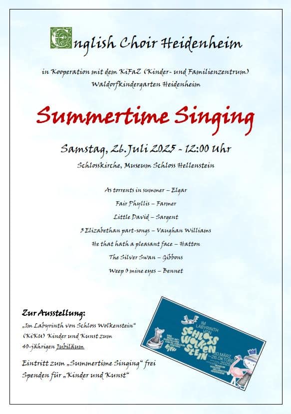 Der English Choir Heidenheim freut sich die „Mach mit“ Ausstellung anlässlich des 40 jährigen Jubiläum von Kinder und Kunst am Samstag den 26.Juli 2025 um 12:00 Uhr in der Schlosskirche (Schloss Hellenstein) musikalisch zu umrahmen.